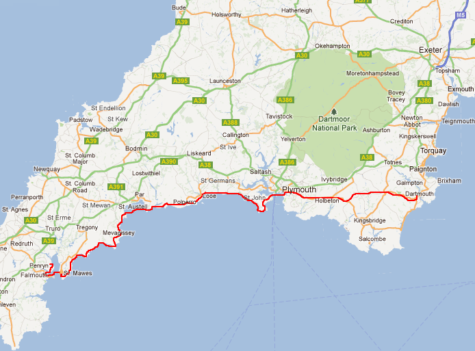 The route map is shown below. It include an itial cycle ride from Dartmouth to Plymouth and then the coastal walk from Plymouth to Mylor.